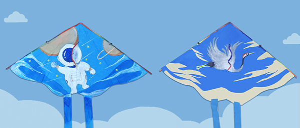 手繪風箏作品完成后,同學們高舉風箏,互相配合,隨著一聲“放”!風箏迎風而起,綠草風箏掩映,藍天白云相依,同學們手持線盤操控著風箏,放飛風箏,放飛夢想。