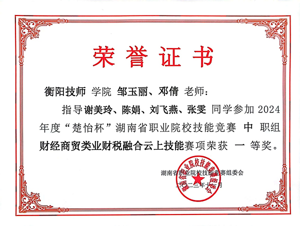 學(xué)院獲2024年“楚怡杯”湖南省職業(yè)院校技能競賽財經(jīng)商貿(mào)類業(yè)財稅融合云上賽項“一等獎”