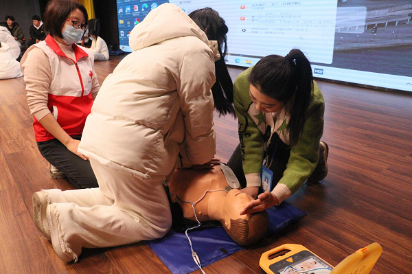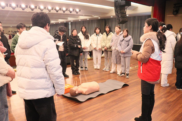 劉蘭分別以心肺復蘇、自動體外除顫器(AED)為主要內容,著重講解了應急救護“黃金4分鐘”、心肺復蘇的重要性及操作流程、AED操作步驟及使用注意事項。為加深同學們對相關急救知識的理解,現(xiàn)場還利用模擬假人進行心肺復蘇、體外除顫示范教學,生動形象。