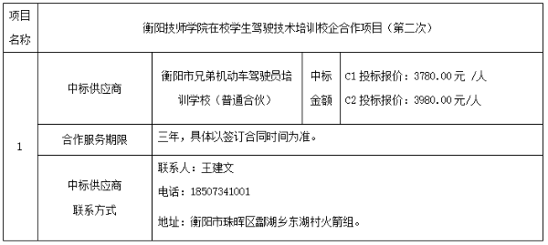 衡陽技師學(xué)院的衡陽技師學(xué)院在校學(xué)生駕駛技術(shù)培訓(xùn)校企合作項目(第二次)院內(nèi)自主招標于2024年1月26日結(jié)束,現(xiàn)將中標結(jié)果公告如下: