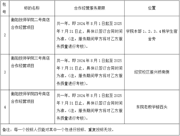 華新項(xiàng)目管理集團(tuán)有限公司受衡陽(yáng)技師學(xué)院的委托,對(duì)衡陽(yáng)技師學(xué)院一號(hào)、二號(hào)、三號(hào)、四號(hào)商店合作經(jīng)營(yíng)項(xiàng)目(第二次)進(jìn)行院內(nèi)自主招標(biāo),邀請(qǐng)符合資質(zhì)條件的投標(biāo)人來(lái)參加投標(biāo)。
