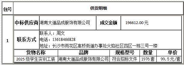 衡陽技師學(xué)院遴選2025級學(xué)生實訓(xùn)工裝供應(yīng)商公開招標采購于2026年03月05日結(jié)束,現(xiàn)將中標(成交)結(jié)果公告如下: