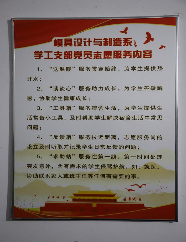 走進(jìn)男生宿舍4棟1樓,“黨員志愿服務(wù)崗”幾個(gè)字特別醒目。模具設(shè)計(jì)與制造系努力實(shí)現(xiàn)“一名黨員一份責(zé)任,一名黨員一面旗幟”,王客客主動向組織申請住進(jìn)學(xué)生宿舍,與學(xué)生同吃同住,以便更好服務(wù)于學(xué)生,為同學(xué)們解決生活、學(xué)習(xí)、思想等方面的困難,并積極動員在校學(xué)生黨員和入黨積極分子在晚自習(xí)下課后,堅(jiān)持在服務(wù)崗實(shí)習(xí)一小時(shí),將“黨員志愿服務(wù)崗”打造成富有特色的學(xué)習(xí)和育人陣地,在學(xué)生黨員中掀起學(xué)黨史的熱潮,并且真正把“我為群眾辦實(shí)事”落在實(shí)處。