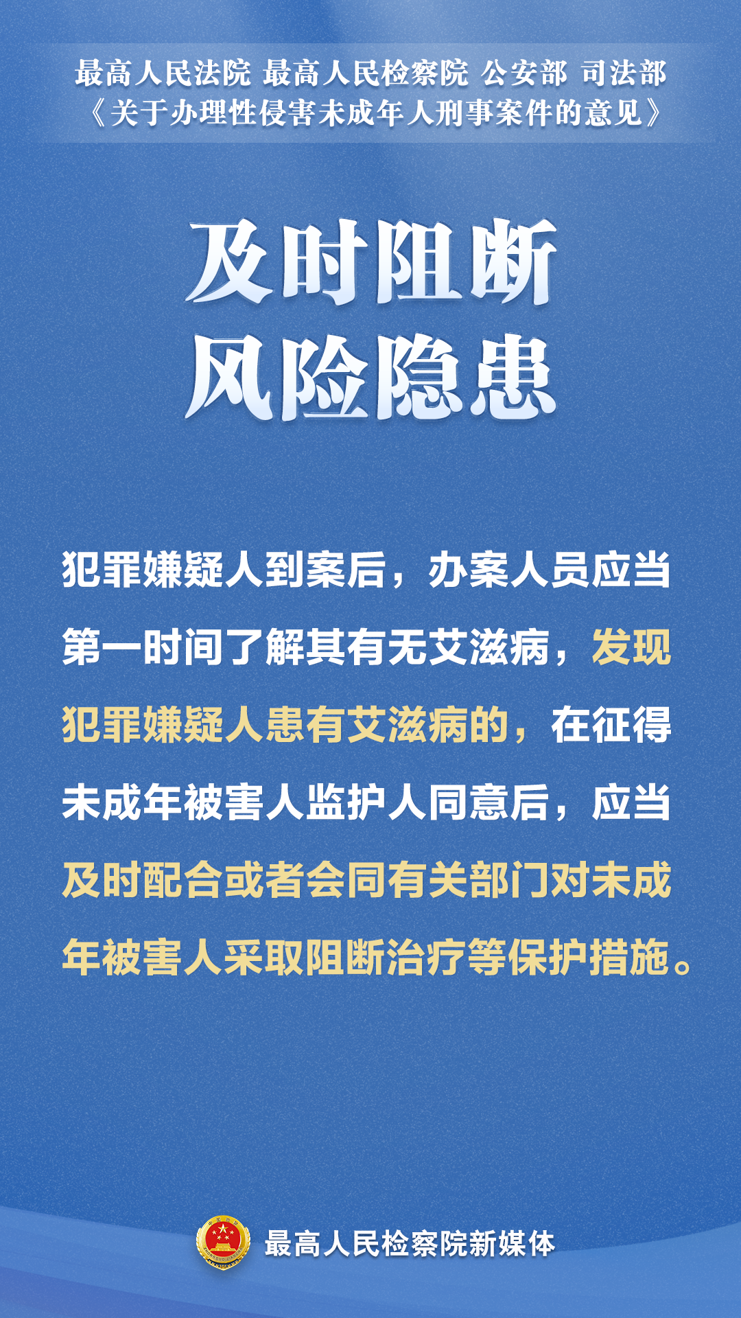 第三十三條 犯罪嫌疑人到案后,辦案人員應(yīng)當?shù)谝粫r間了解其有無艾滋病,發(fā)現(xiàn)犯罪嫌疑人患有艾滋病的,在征得未成年被害人監(jiān)護人同意后,應(yīng)當及時配合或者會同有關(guān)部門對未成年被害人采取阻斷治療等保護措施。