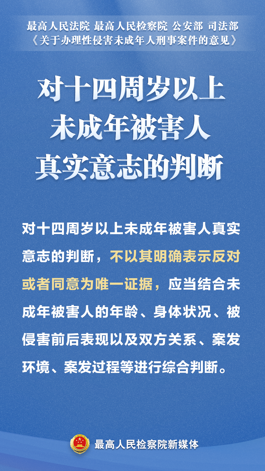 第三十一條 對十四周歲以上未成年被害人真實意志的判斷,不以其明確表示反對或者同意為唯一證據(jù),應(yīng)當結(jié)合未成年被害人的年齡、身體狀況、被侵害前后表現(xiàn)以及雙方關(guān)系、案發(fā)環(huán)境、案發(fā)過程等進行綜合判斷。