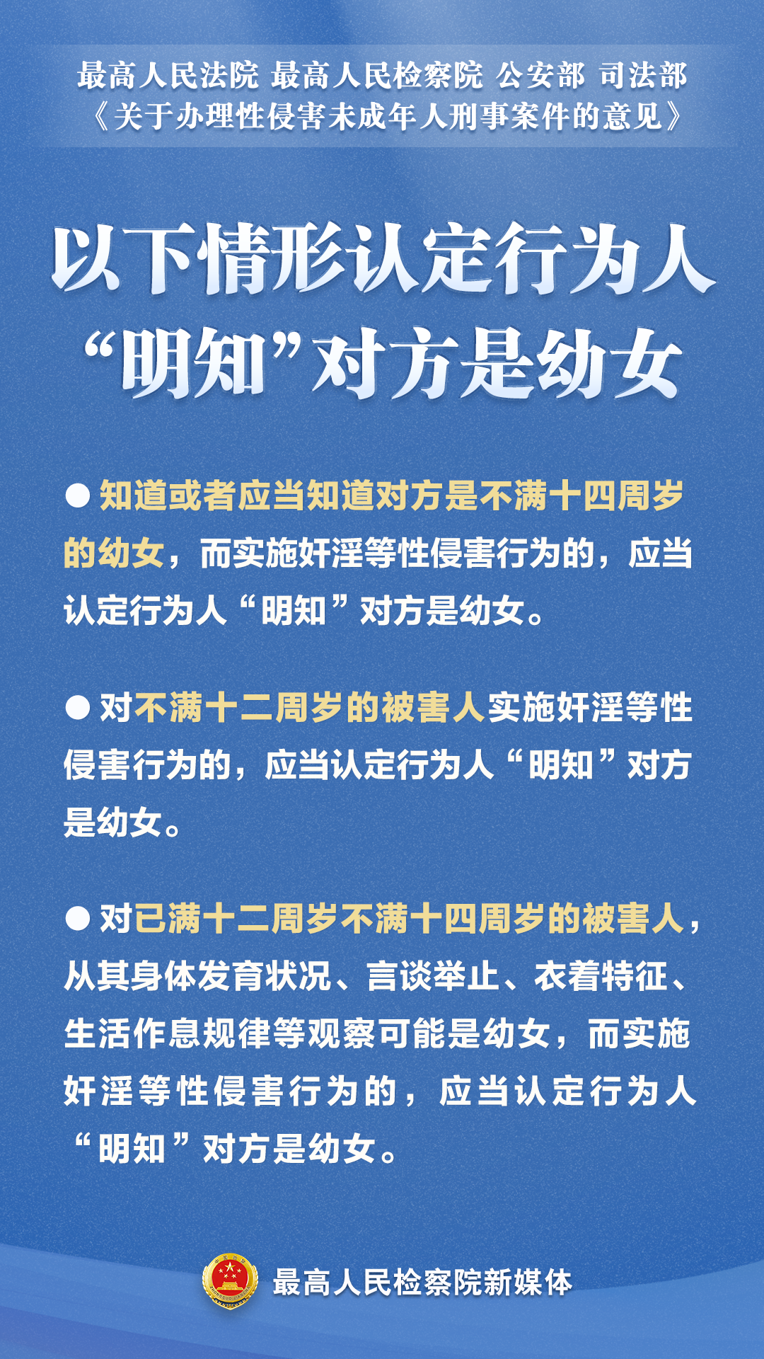 對已滿十二周歲不滿十四周歲的被害人,從其身體發(fā)育狀況、言談舉止、衣著特征、生活作息規(guī)律等觀察可能是幼女,而實施奸淫等性侵害行為的,應(yīng)當認定行為人“明知”對方是幼女。