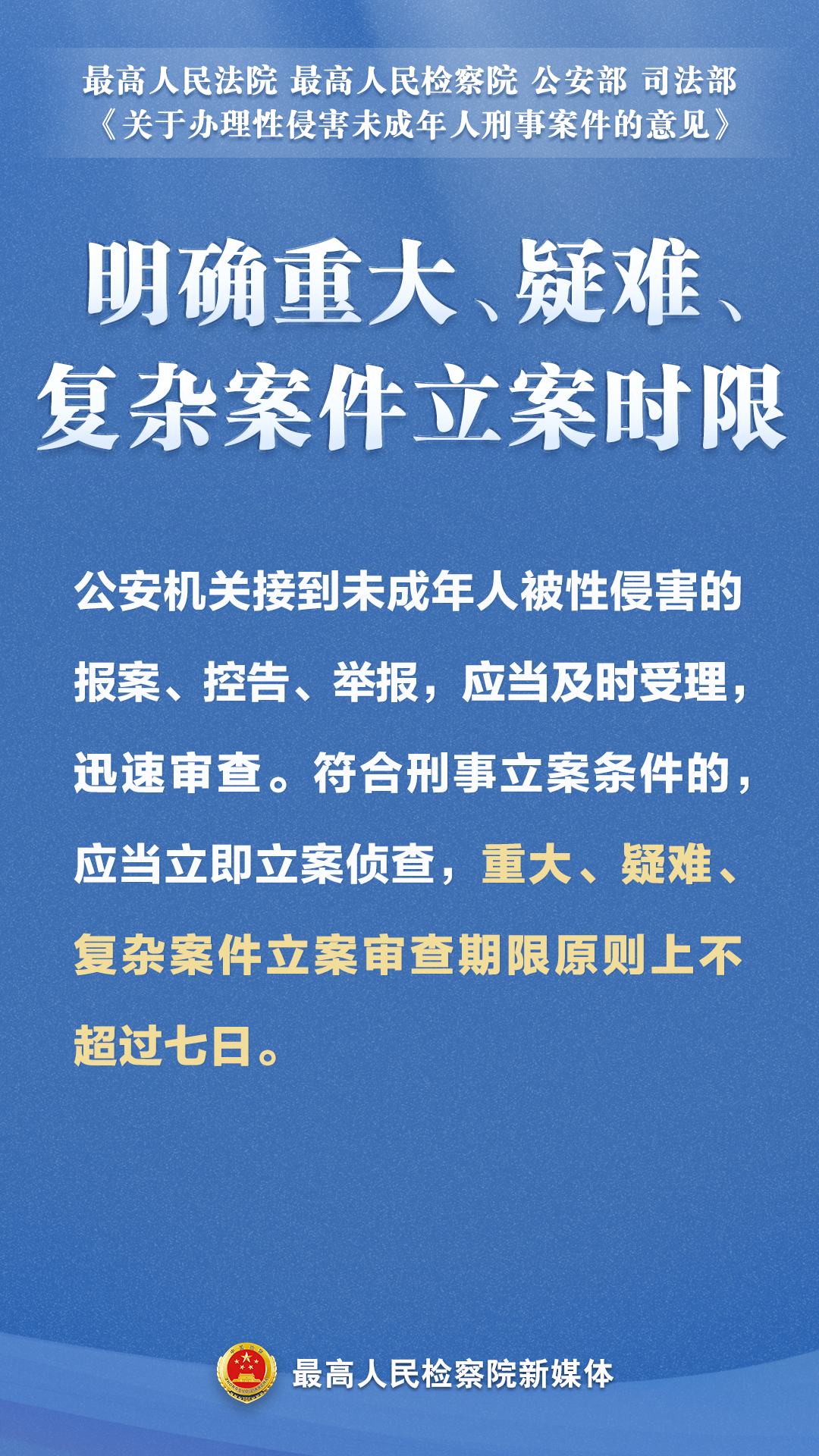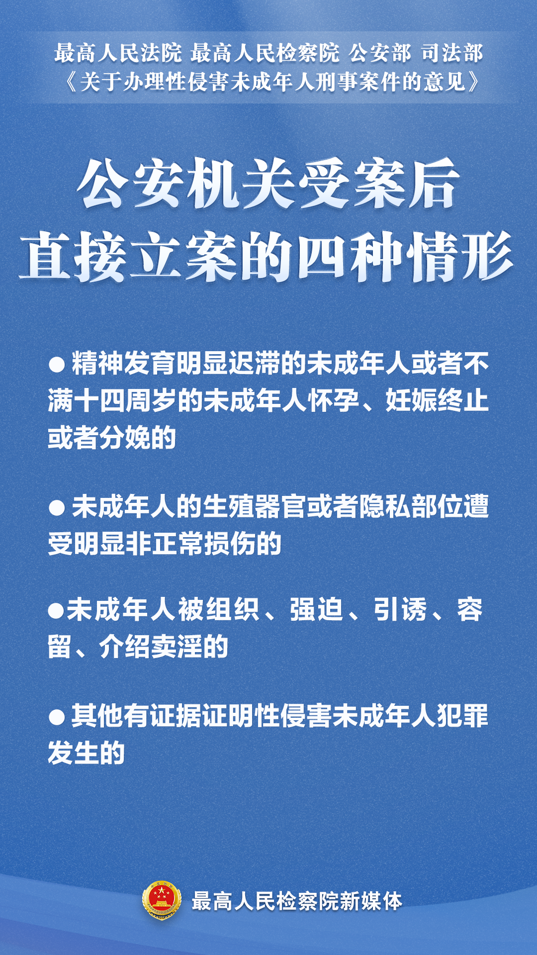 第五條 公安機關(guān)接到未成年人被性侵害的報案、控告、舉報,應(yīng)當及時受理,迅速審查。符合刑事立案條件的,應(yīng)當立即立案偵查,重大、疑難、復(fù)雜案件立案審查期限原則上不超過七日。具有下列情形之一,公安機關(guān)應(yīng)當在受理后直接立案偵查: