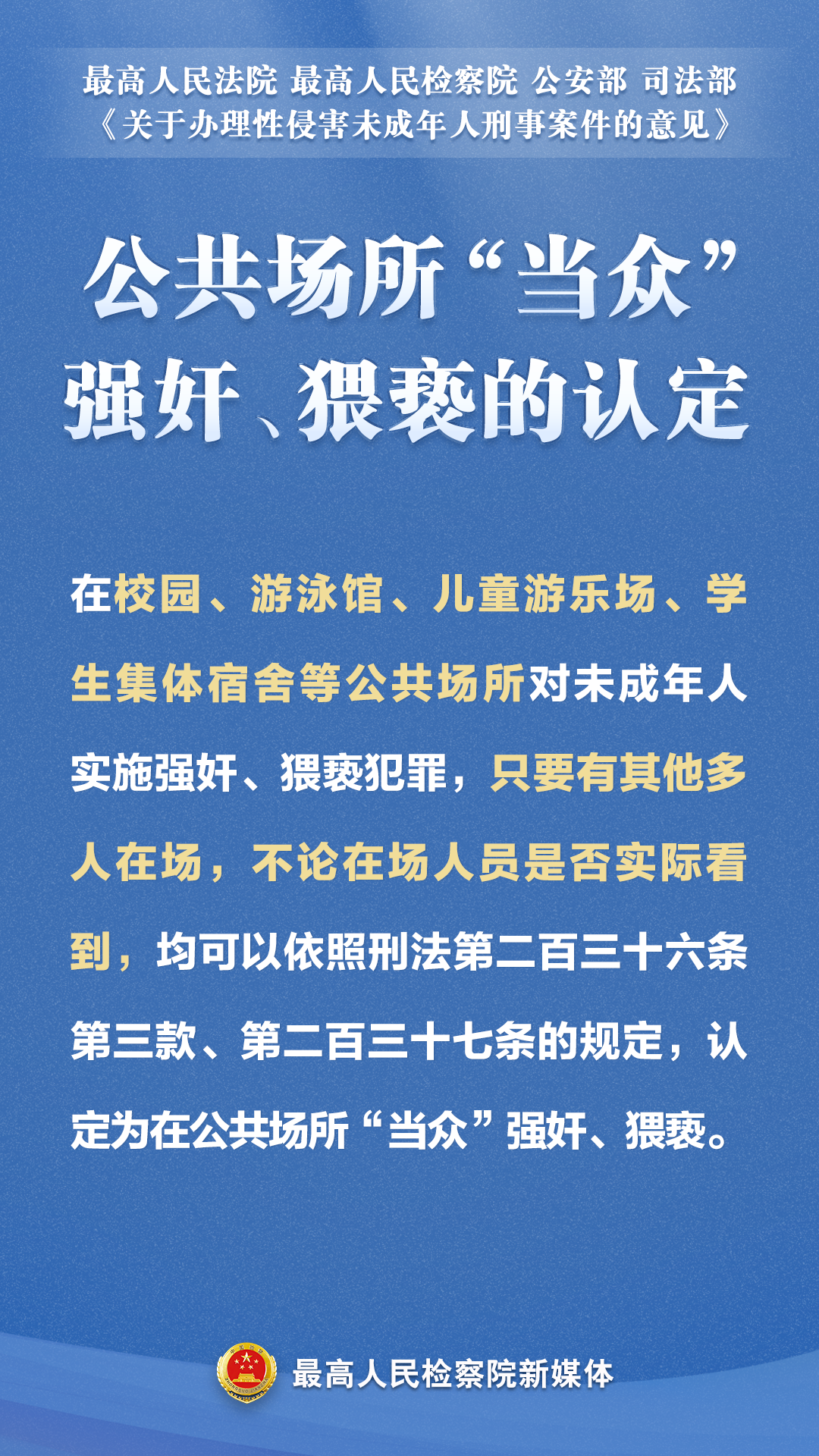 第十八條 在校園、游泳館、兒童游樂場、學(xué)生集體宿舍等公共場所對未成年人實施強奸、猥褻犯罪,只要有其他多人在場,不論在場人員是否實際看到,均可以依照刑法第二百三十六條第三款、第二百三十七條的規(guī)定,認定為在公共場所“當眾”強奸、猥褻。