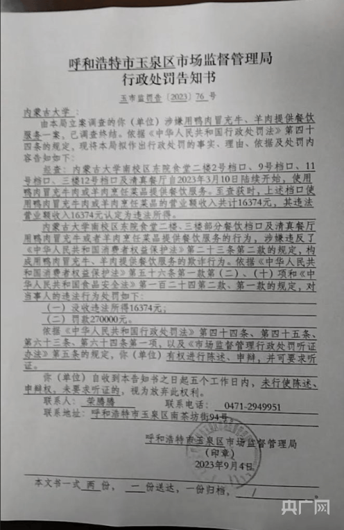 內(nèi)蒙古大學(xué)食堂用鴨肉冒充牛羊肉,罰款27萬