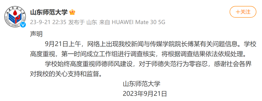 山東師范大學(xué)官博就網(wǎng)絡(luò)上出現(xiàn)新聞與傳媒學(xué)院院長傅某有關(guān)問題信息發(fā)布聲明