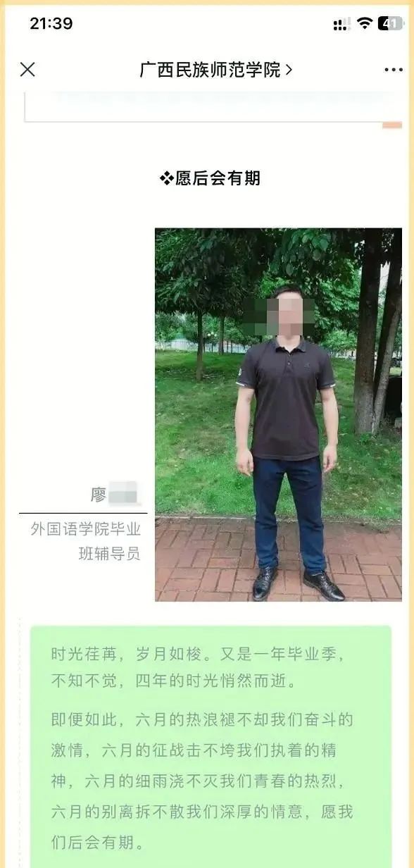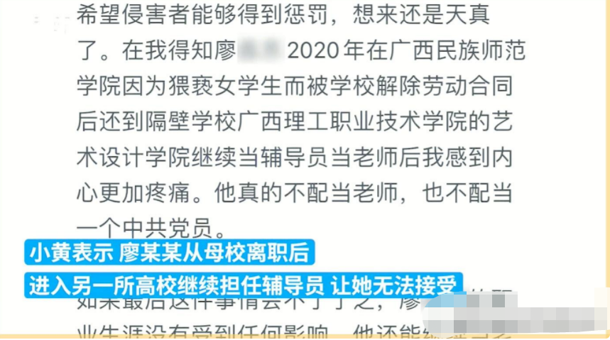 當(dāng)她得知廖先生因?yàn)殁C女學(xué)生的行為,被廣西民族師范學(xué)院解除勞動(dòng)合同,并繼續(xù)在廣西理工職業(yè)技術(shù)學(xué)院的藝術(shù)設(shè)計(jì)學(xué)院擔(dān)任輔導(dǎo)員和教師時(shí),她內(nèi)心感到更加痛苦。