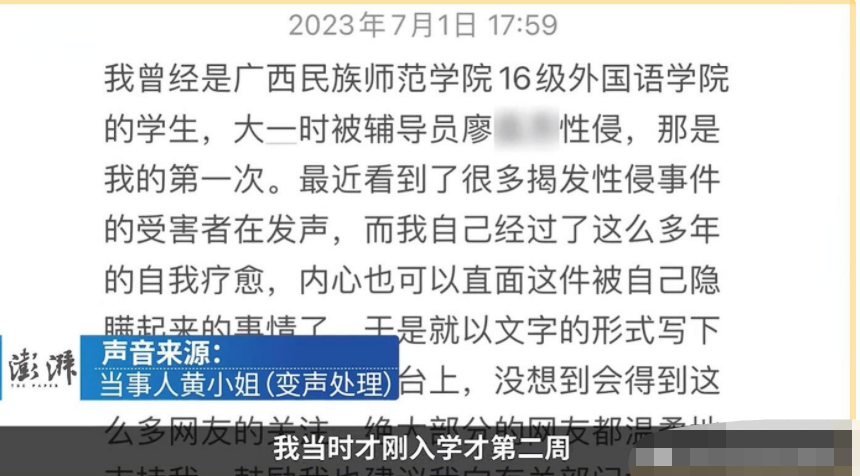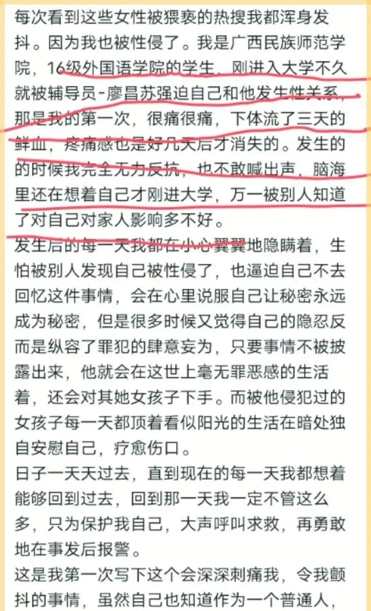 近日,廣西民族師范學(xué)院16級(jí)畢業(yè)女大學(xué)生(就讀于外國(guó)語學(xué)院)在網(wǎng)絡(luò)平臺(tái)上公開指控,在她大一的時(shí)候遭受了外國(guó)語學(xué)院輔導(dǎo)員的性侵 。