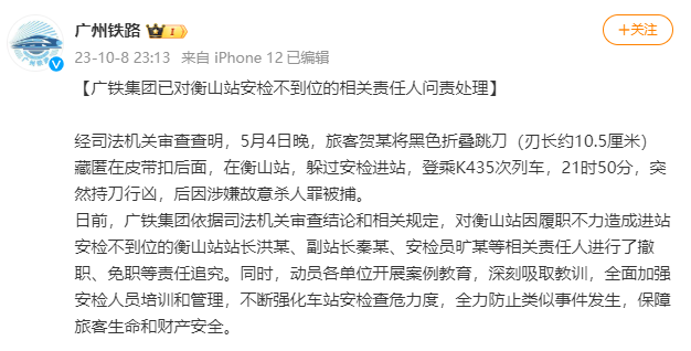 衡山站安檢不到位 相關(guān)責(zé)任人被撤職或免職