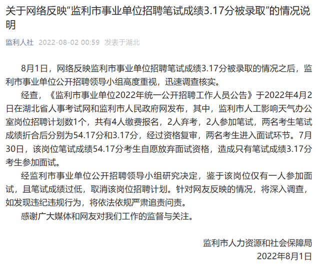 監(jiān)利市人社局關(guān)于網(wǎng)絡(luò)反映事業(yè)單位招聘“筆試成績3.17分被錄取”的情況說明