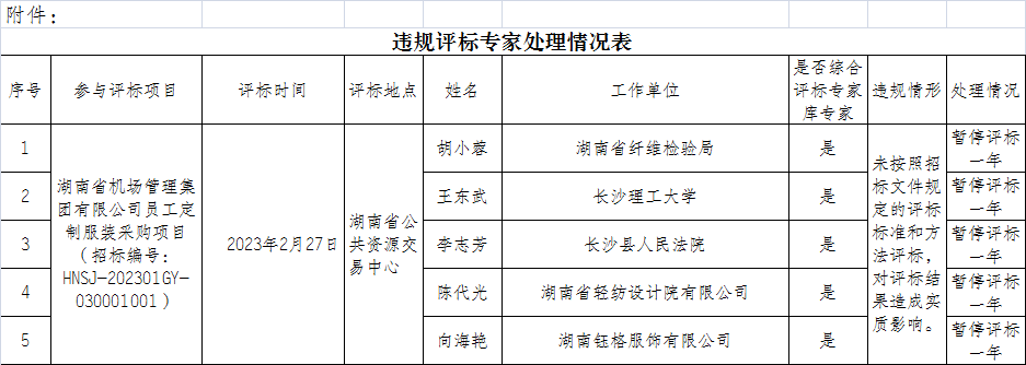 根據(jù)《湖南省綜合評標專家?guī)旌驮u標專家管理辦法》第三十七條第三項規(guī)定,為嚴肅評標工作紀律,加強對評標專家的監(jiān)督管理,經(jīng)研究決定,對胡小蓉、王東武、李志芳、陳代光、向海艷等5名評標專家暫停評標一年。