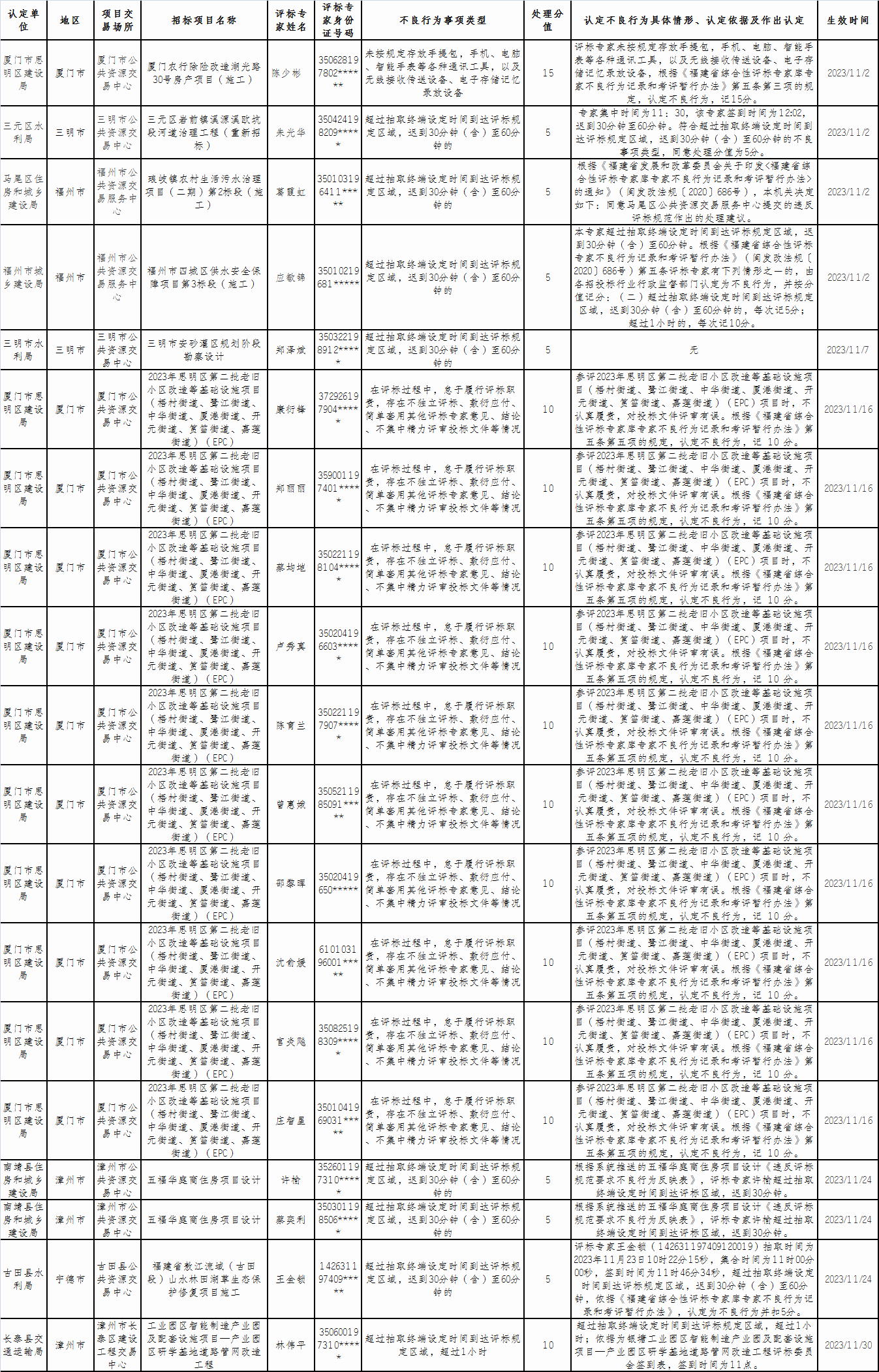 福建省評標(biāo)專家不良行為公示(2023年11月)