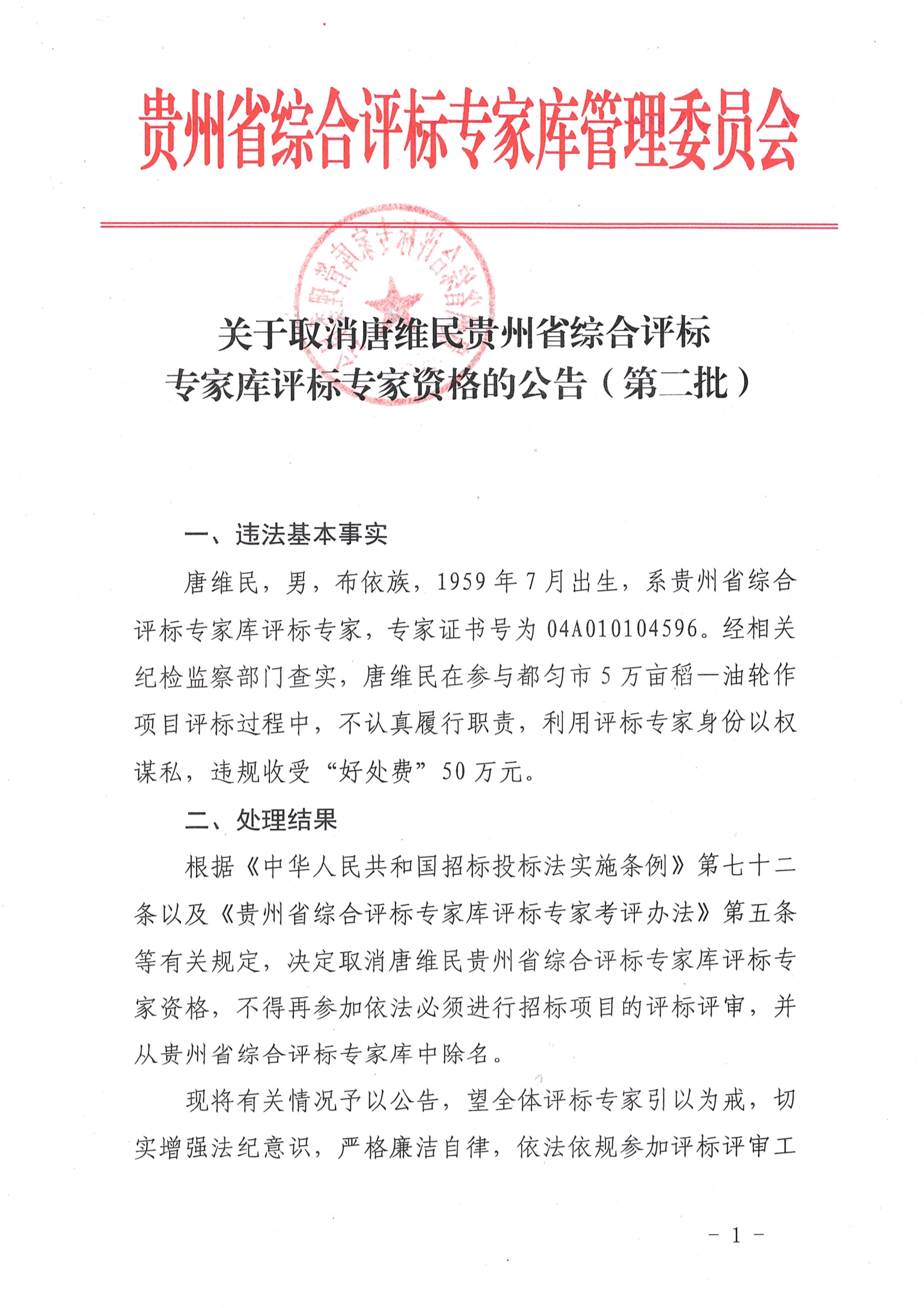 貴州省綜合評標專家?guī)旃芾砦瘑T會關(guān)于取消唐維民評標專家資格的公告