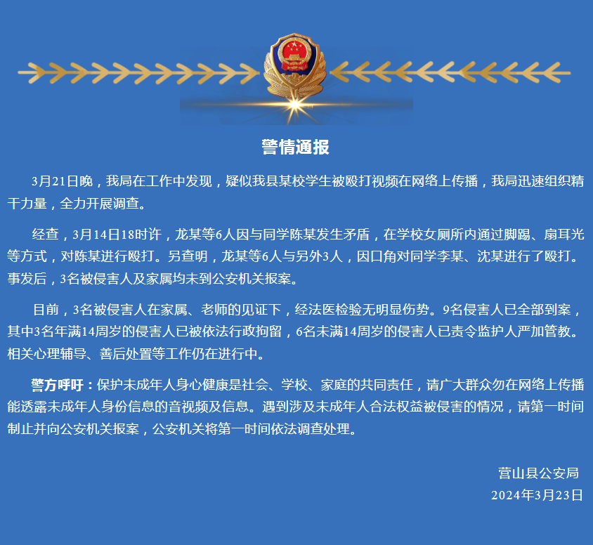 四川省營(yíng)山縣公安局通報(bào)“學(xué)生在女廁所被毆打”:9名侵害人已全部到案