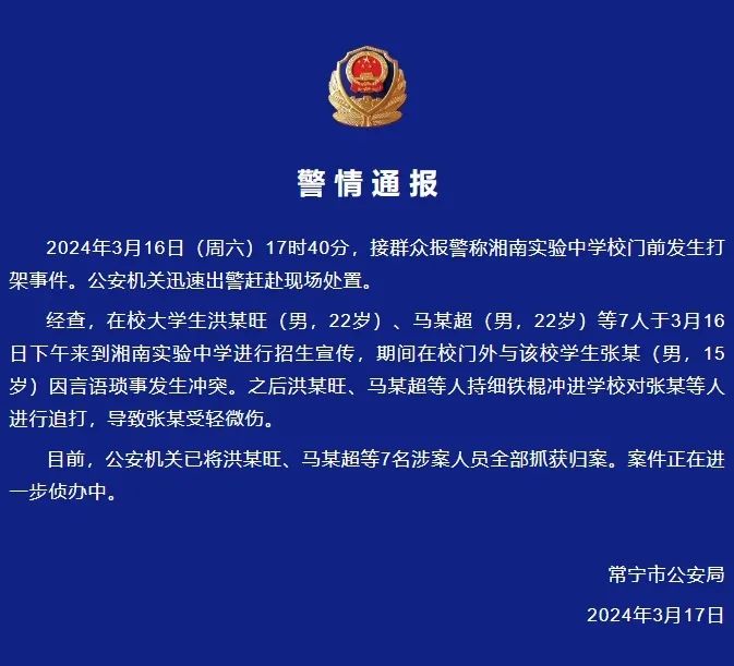 常寧市公安局關(guān)于湘南實(shí)驗(yàn)中學(xué)校門前打架事件的警情通報(bào)