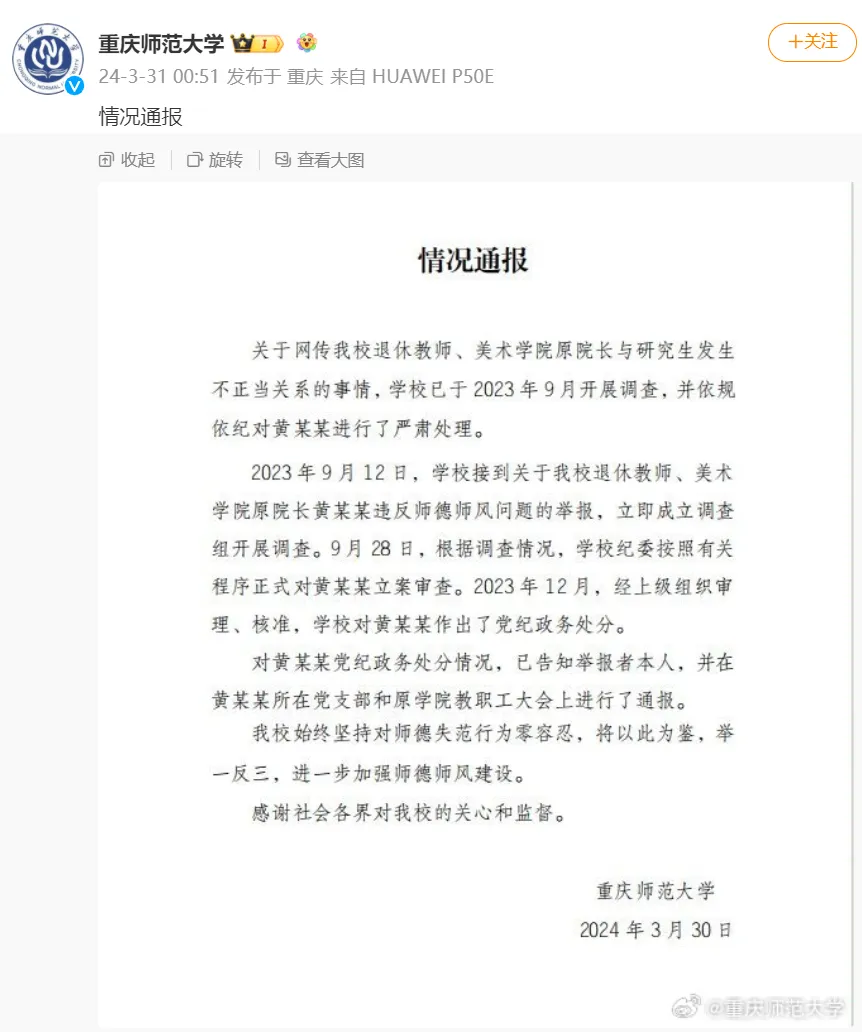 重慶師范大學(xué)關(guān)于美術(shù)學(xué)院原院長黃某某違反師德師風(fēng)問題舉報的情況通報