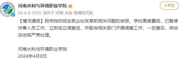 河南水利與環(huán)境職業(yè)學(xué)院關(guān)于網(wǎng)傳招生就業(yè)處張某帆相關(guān)問題的情況通報