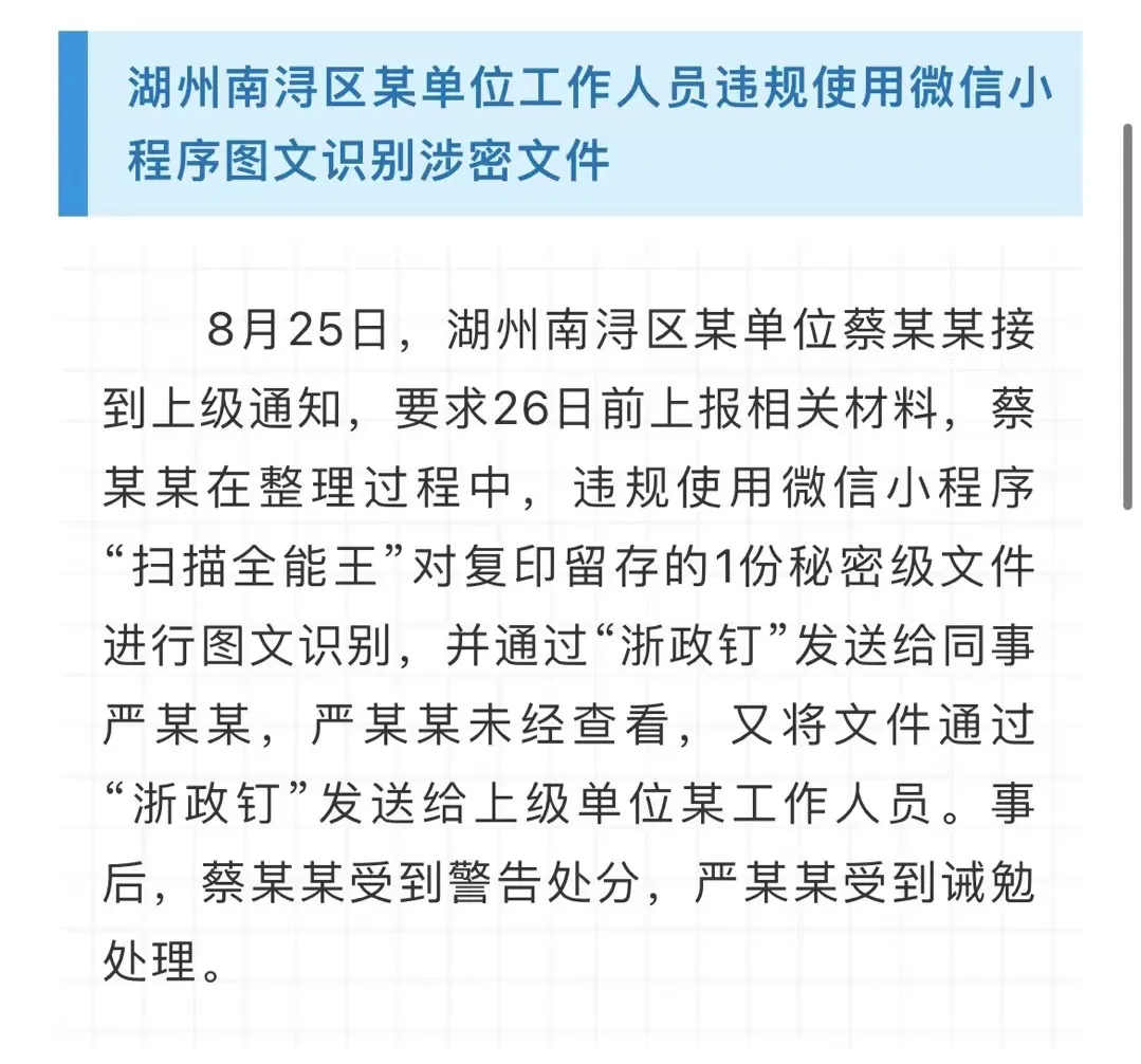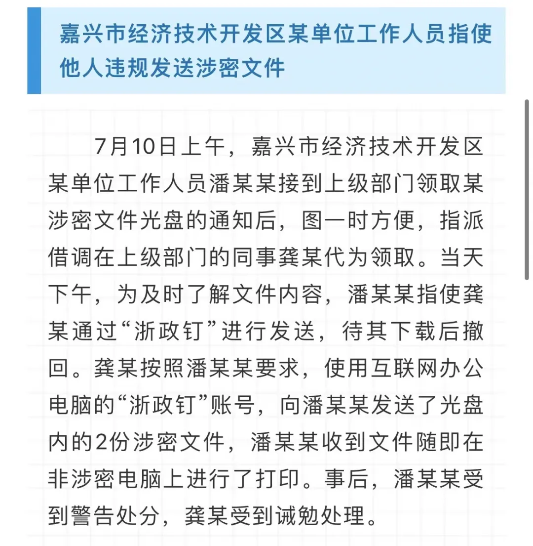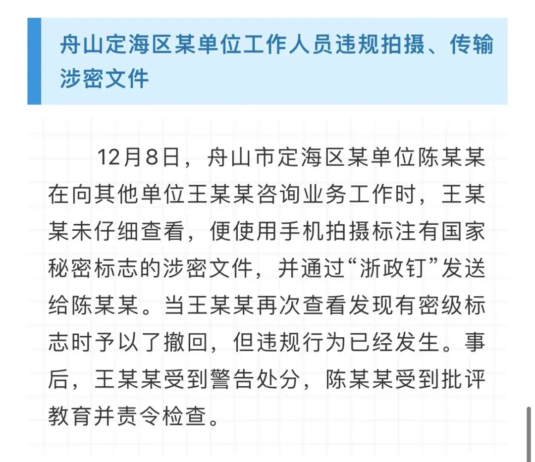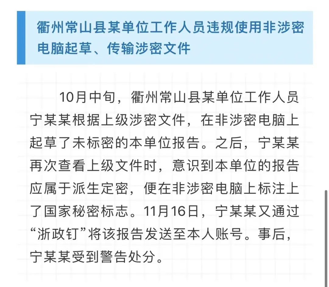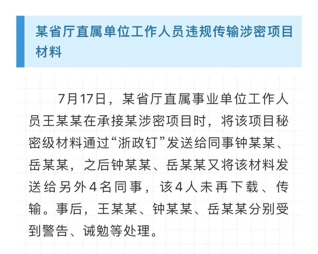 2023年,浙江省委保密辦、省國家保密局依紀(jì)依法依規(guī)查處了一批違反保密法律法規(guī)的案件,為充分發(fā)揮懲前毖后的警示教育作用,現(xiàn)將7起典型案例通報(bào)如下。