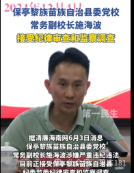 保亭縣委黨校常務(wù)副校長施海波涉嫌嚴(yán)重違紀(jì)違法,目前正接受保亭縣紀(jì)委監(jiān)委紀(jì)律審查和監(jiān)察調(diào)查。