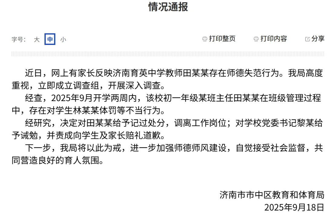 9月18日,山東濟(jì)南市中區(qū)教體局通報(bào)育英中學(xué)初一年級(jí)某班主任田某某體罰學(xué)生被處分。經(jīng)查,9月開學(xué)兩周內(nèi),田某某在班級(jí)管理過程中存在對(duì)學(xué)生林某某體罰等不當(dāng)行為。學(xué)生母親付女士稱,看了孩子入學(xué)這兩周在校的3個(gè)監(jiān)控片段,孩子被老師罰站、扇耳光。通報(bào)稱,田某某被記過處分,調(diào)離工作崗位;該校黨委書記黎某被誡勉。付女士稱,已就此事向警方報(bào)警,并委托律師將起訴涉事老師,追究相應(yīng)責(zé)任。濟(jì)南市教育局稱,正關(guān)注此事。