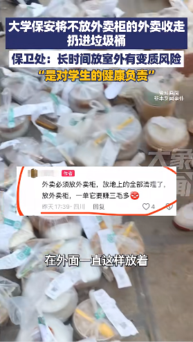 9月17日,我們關(guān)注到我校保安將未放柜外賣扔垃圾桶相關(guān)事件,對(duì)于保安人員在管理過程中的簡(jiǎn)單、粗暴行為給學(xué)生造成了損失,我們表示深深的歉意。學(xué)校立即啟動(dòng)對(duì)受損學(xué)生外賣補(bǔ)償?shù)墓ぷ?。下一步,學(xué)校將逐級(jí)調(diào)查核實(shí),對(duì)相關(guān)部門及工作人員進(jìn)行追責(zé)處理。